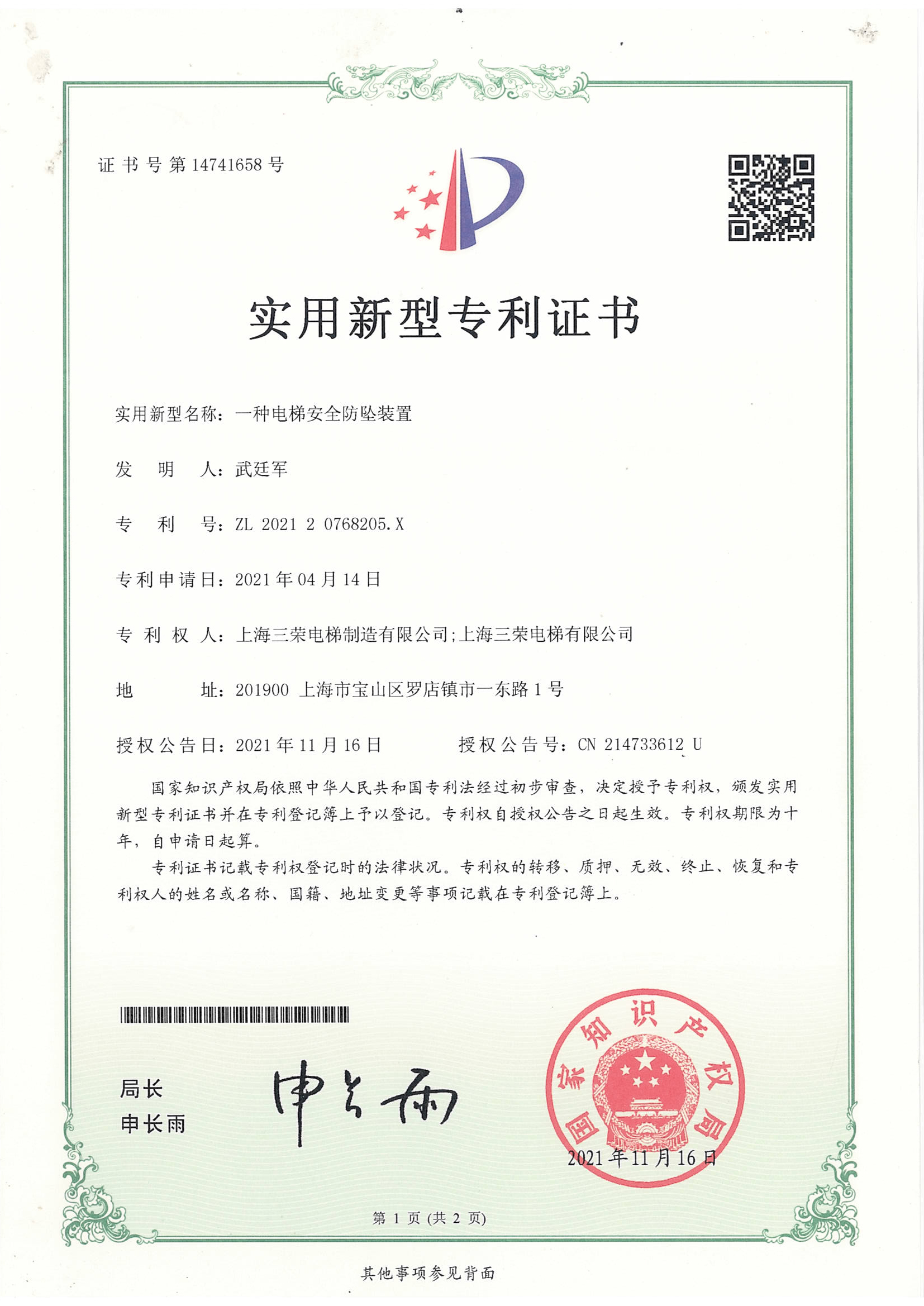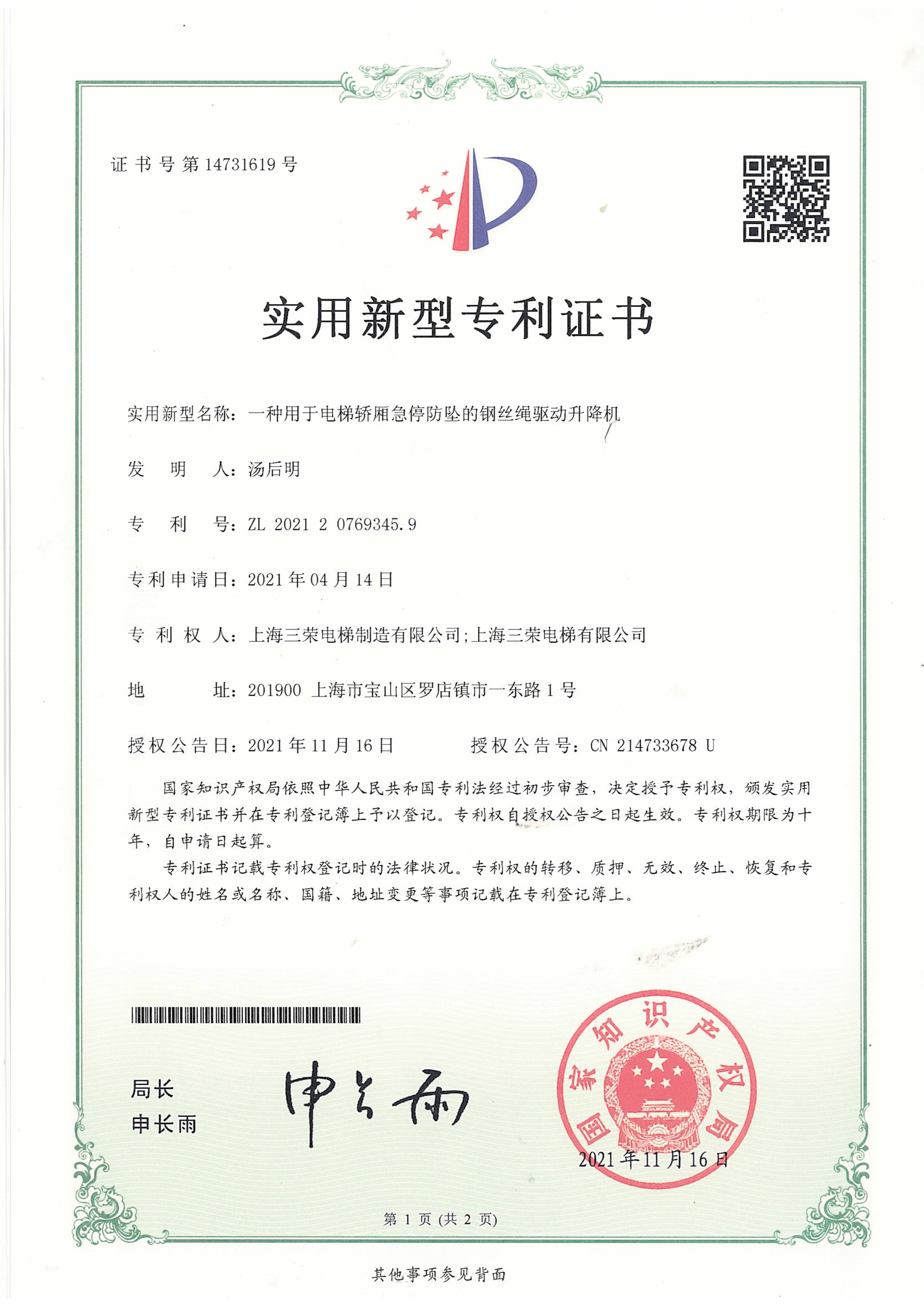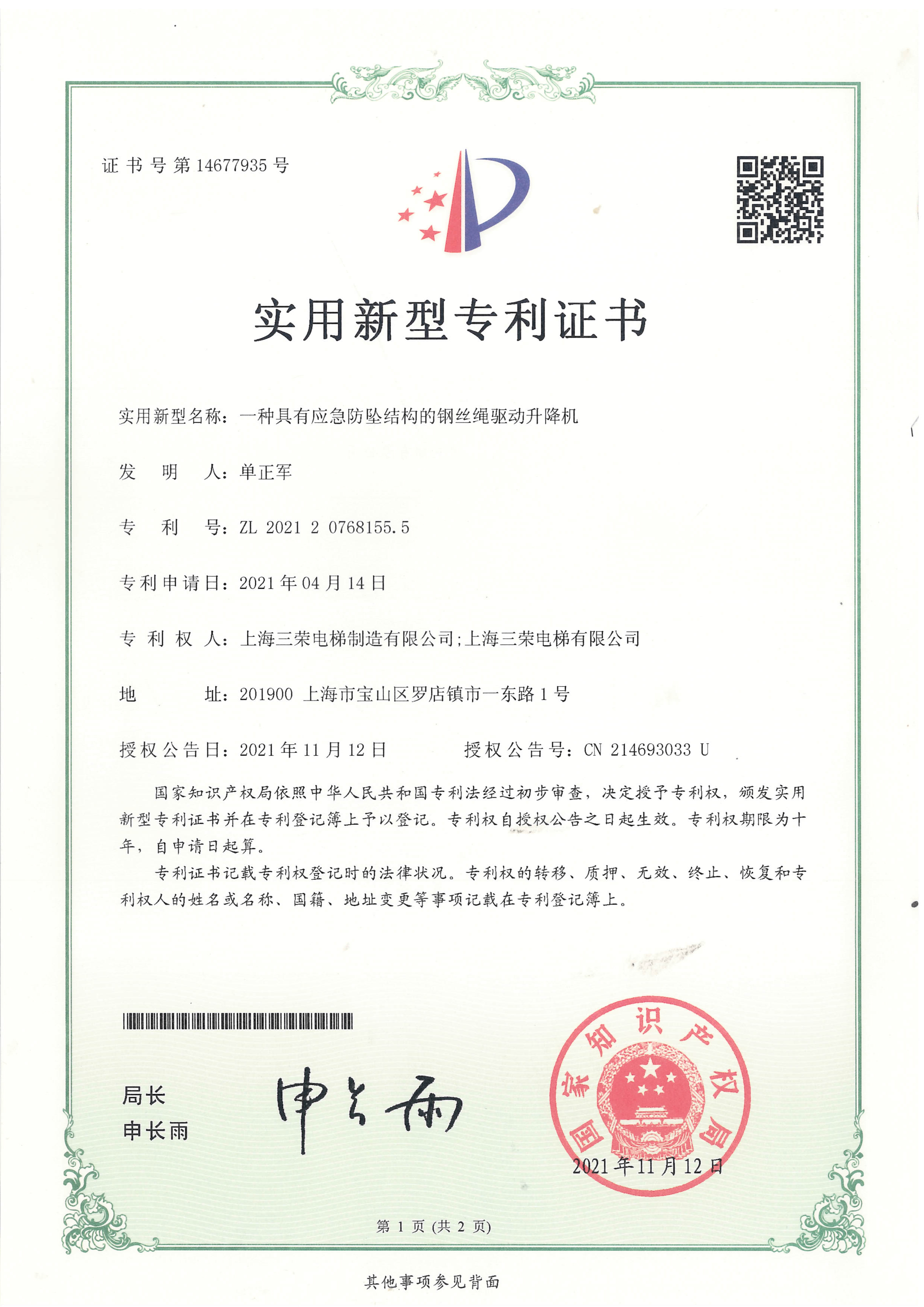 全球中小企业联盟电梯研发与制造基地证书